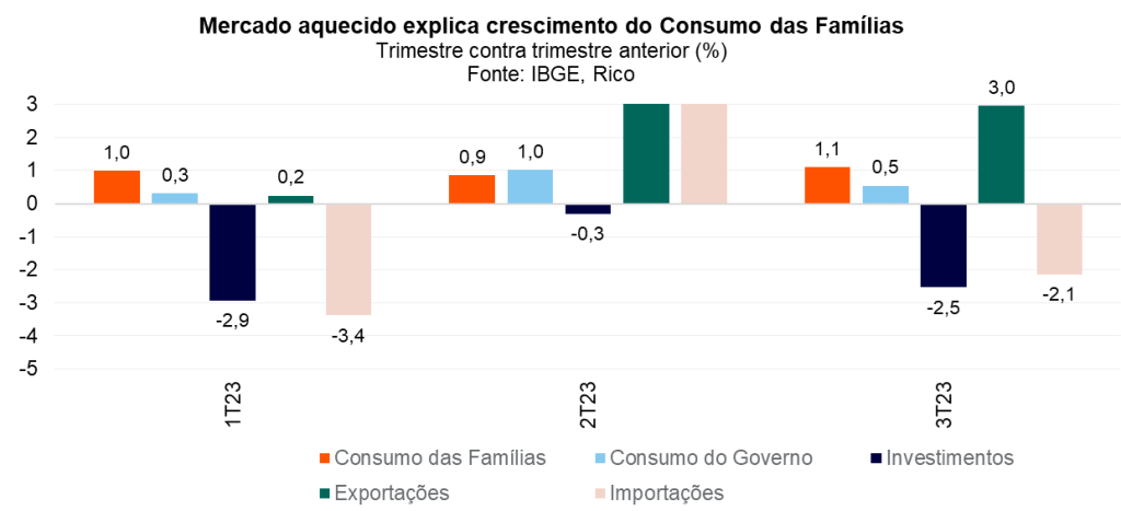 Enquanto isso, do lado da demanda – ou seja, aqueles que puxam o PIB demandando por todos esses bens e serviços produzidos – o consumo das famílias foi mais uma vez o destaque, crescendo 1,1% no terceiro trimestre. O mercado de trabalho ainda aquecido, a queda da inflação e o efeito ainda presente de maiores benefícios fiscais implementados ao longo do ano ajudaram a alimentar a aquisição de bens e serviços por parte das famílias.