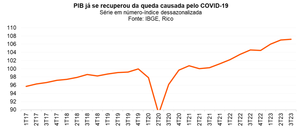 Lembrando que a economia brasileira já se recuperou da forte contração causada pela pandemia da Covid-19, apesar de ainda sentirmos efeitos indiretos em diferentes setores da economia e da sociedade. De fato, o PIB do Brasil se encontra 7,2% acima do patamar registrado no pré-pandemia (no quarto trimestre de 2019).