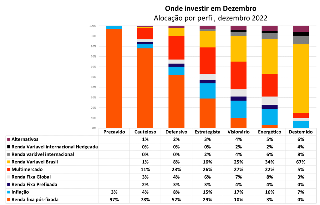 Agora que você já está atualizado da nossa visão para a economia nos próximos meses, confira no gráfico abaixo nossas recomendações de investimento atualizadas, de acordo com o seu perfil de investidor, e algumas sugestões de ativos recomendados nesse cenário.