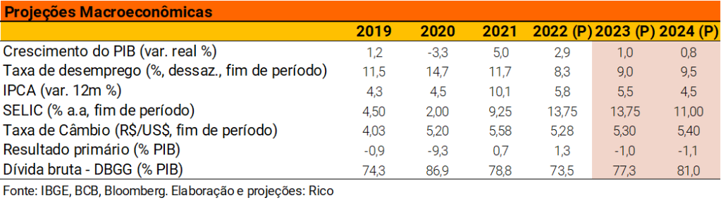 Porém, ainda vemos a economia brasileira crescendo 1,0% em 2023. Isso porque setores menos sensíveis à desaceleração da economia doméstica ainda devem ter boa performance, especialmente o agropecuário – impulsionados por safras de grãos que tendem a registrar recordes históricos. Na mesma linha, a retomada da economia chinesa deve contribuir para a manutenção do preço de commodities em nível historicamente alto.
