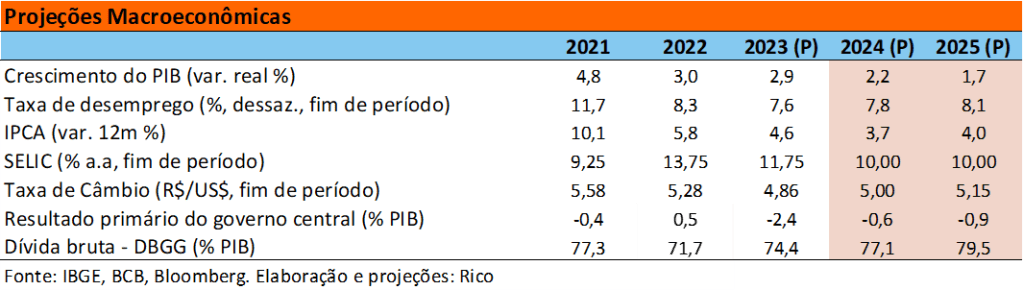 Nesse cenário, projetamos que o IPCA encerre 2024 em 3,7% e em 4,0% em 2025 – ambos acima da meta do Banco Central, mas dentro do seu limite superior.