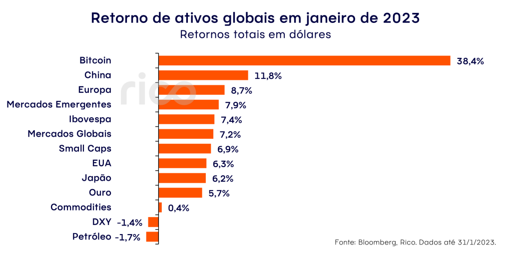 O mercado de ações globais teve um mês de fortes altas, subindo 7,2%. O Ibovespa também teve um bom desempenho de +7,4%, ajudado por um Real que valorizou +4,1% contra do dólar. E o principal índice americano, S&P 500, subiu 6,3% e registrou o melhor janeiro desde 2019. Mas o destaque ficou por conta do Bitcoin, que disparou 38,4% no primeiro mês de 2023 e superou as bolsas globais com maior apetite por risco por investidores.