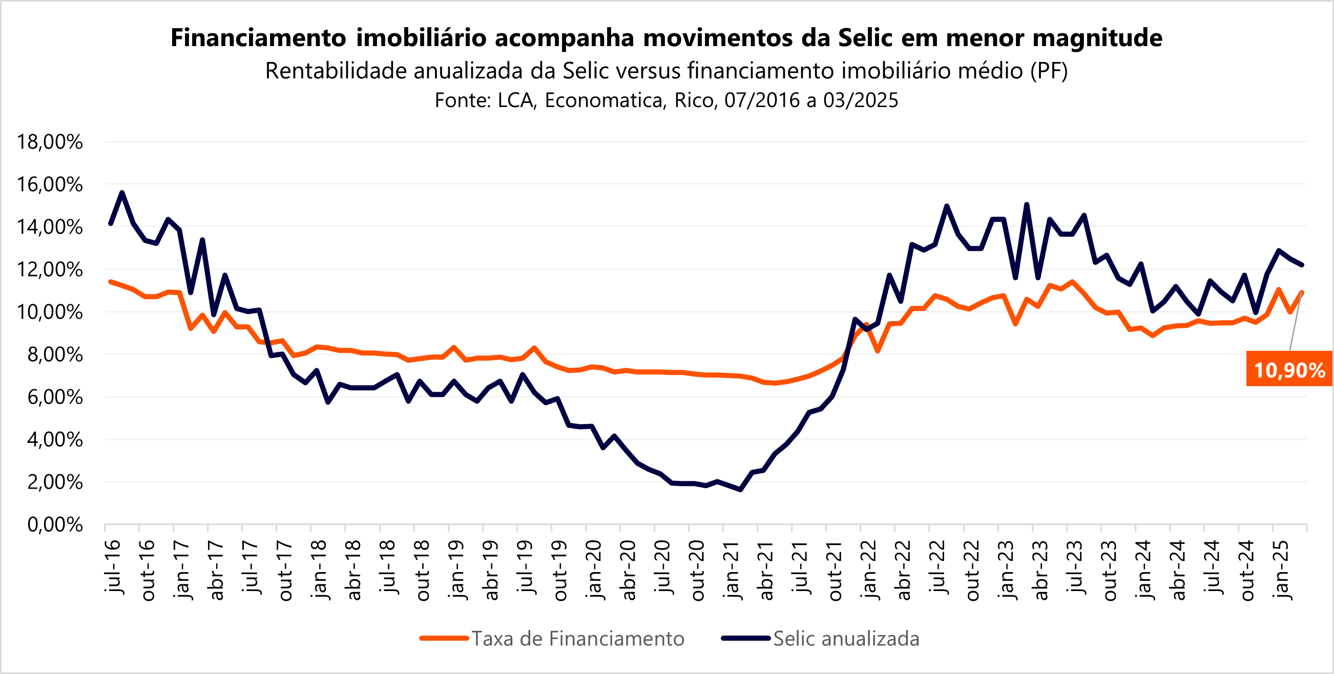 Vale notar que a variação nos juros imobiliários é menos intensa que em outras modalidades de crédito. No mercado imobiliário, a variação de 1 ponto percentual na taxa Selic leva a uma variação em média de apenas 0,43 ponto percentual na taxa de financiamento em aproximadamente 6 meses.