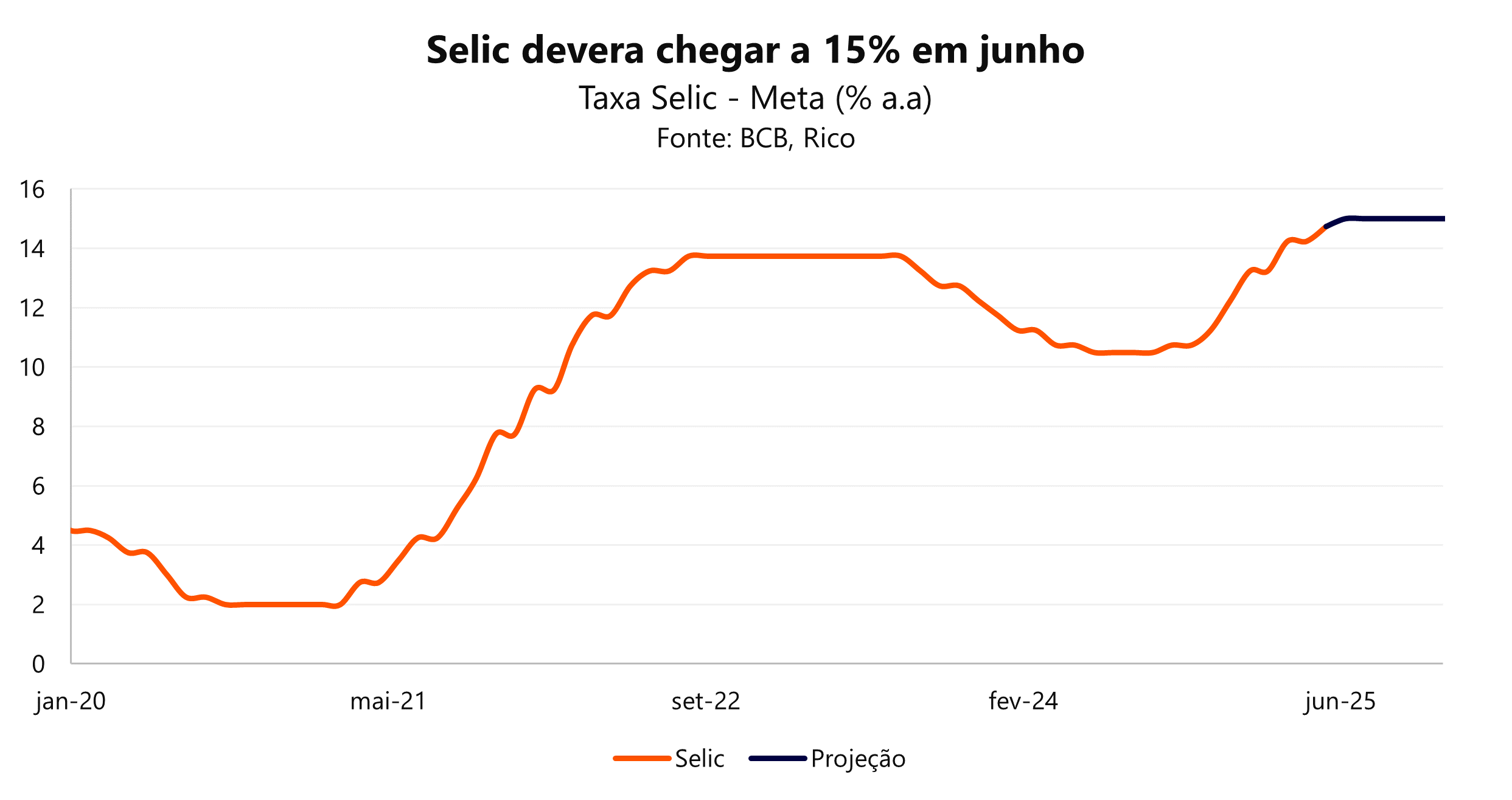 Por aqui, nossa taxa básica de juros, a taxa Selic, segue em alta. Com a inflação ainda em “alerta amarelo”, nossa projeção indica que o Banco Central deverá elevar a Selic até o patamar de 15,00% ao ano.
