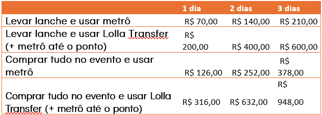 – Levar lanches e usar Lolla Transfer (+metrô) gera uma economia de R$ 348 em relação a quem compra tudo no evento e usa Lolla Transfer (+metrô).