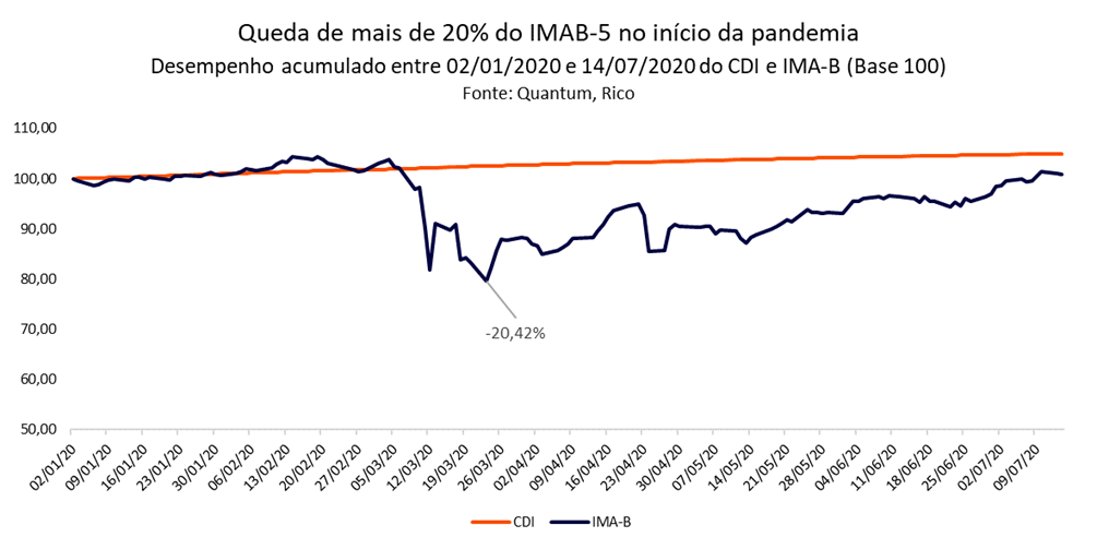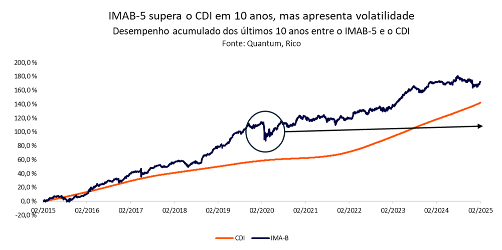 Dessa forma, o IMA-B mede o desempenho dos títulos atrelados à inflação e, historicamente, tem apresentado alta volatilidade devido à marcação a mercado dos títulos.