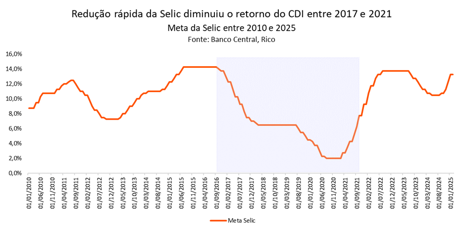 Para ilustrar, a taxa Selic foi reduzida de 14,25% em setembro de 2016 para 6,5% em março de 2018 – um ciclo historicamente rápido, refletido na menor rentabilidade observada no CDI no período.