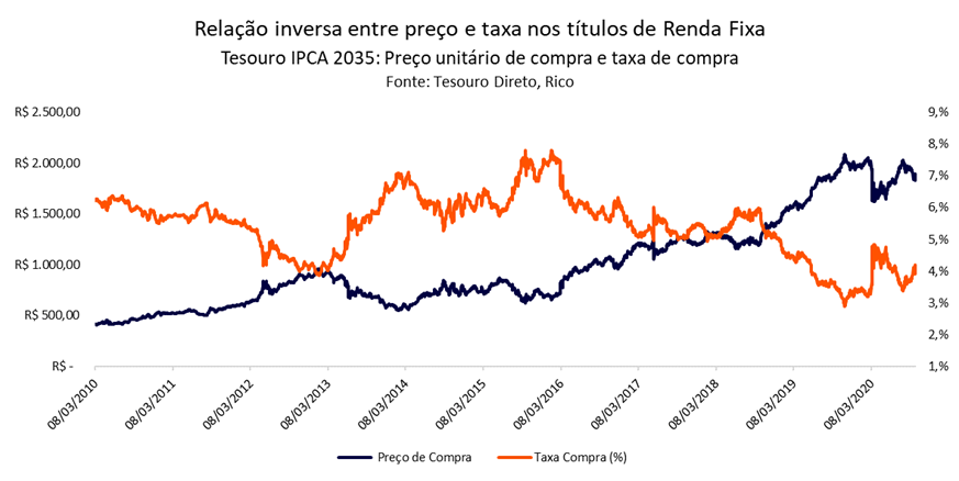 Já o Tesouro IPCA+ é um título híbrido, que paga uma taxa fixa acrescida da variação da inflação no período – até o vencimento do título.