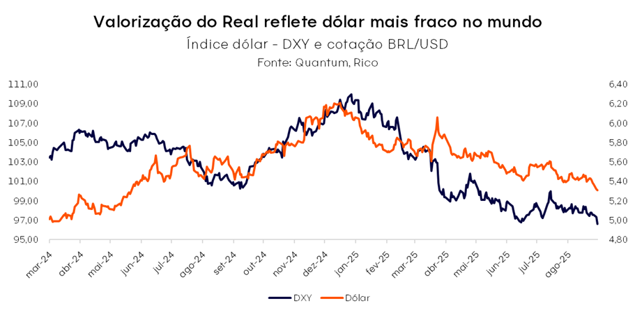 Deste modo, apesar da forte valorização do Real observada no ano, a percepção de risco país segue fator central para o controle de preços adiante. Vale destacar que entendemos que a dinâmica da nossa moeda no ano reflete muito mais o enfraquecimento do dólar no mundo, do que uma melhora na percepção de risco em relação ao Brasil.