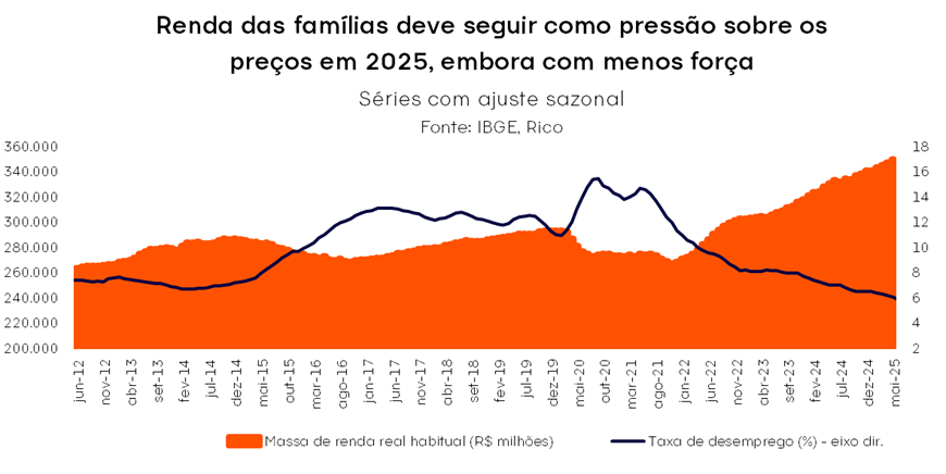 Por outro lado, a resiliência do mercado de trabalho segue como fonte de pressão sobre os preços. Diante de uma taxa de desemprego que segue historicamente baixa, o rendimento médio do trabalho continua a subir acima da inflação.