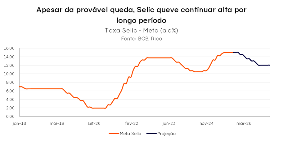 Nesse contexto, projetamos que o Banco Central só terá espaço para iniciar o ciclo de redução da Selic no primeiro trimestre de 2026, com possibilidade de queda até o patamar de 12,0% — ainda considerado um nível contracionista para a economia.