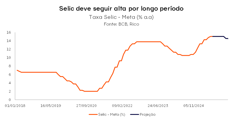 Nesse contexto, projetamos que o Banco Central só terá espaço para iniciar o ciclo de redução da Selic no primeiro trimestre de 2026, com possibilidade de queda até o patamar de 12,5% — ainda considerado um nível contracionista para a economia.