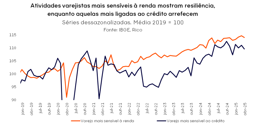 Por outro lado, alguns dados já começam a sinalizar certo arrefecimento da economia. Um exemplo é a concessão de crédito para empresas e pessoas físicas, que começou a enfraquecer nos últimos meses, impactando setores mais sensíveis ao crédito, como construção civil, indústria manufatureira e comércio de bens como imóveis, veículos e eletroeletrônicos.