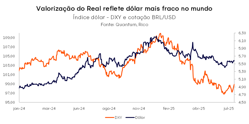Além disso, o Copom seguiu destacando a incerteza em torno do risco fiscal na maior economia do mundo. Diante de questionamentos sobre o papel do dólar e ativos americanos no mundo, a gestão das contas públicas e o endividamento nos Estados Unidos seguiram no radar de riscos no mundo. Afinal, com investidores “cobrando mais” para financiar a economia americana, juros no mundo todo são pressionados por tabela.
