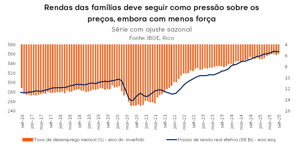 Por outro lado, a resiliência do mercado de trabalho segue como fonte de pressão sobre os preços. Diante de uma taxa de desemprego que segue historicamente baixa, o rendimento médio do trabalho continua a subir acima da inflação.