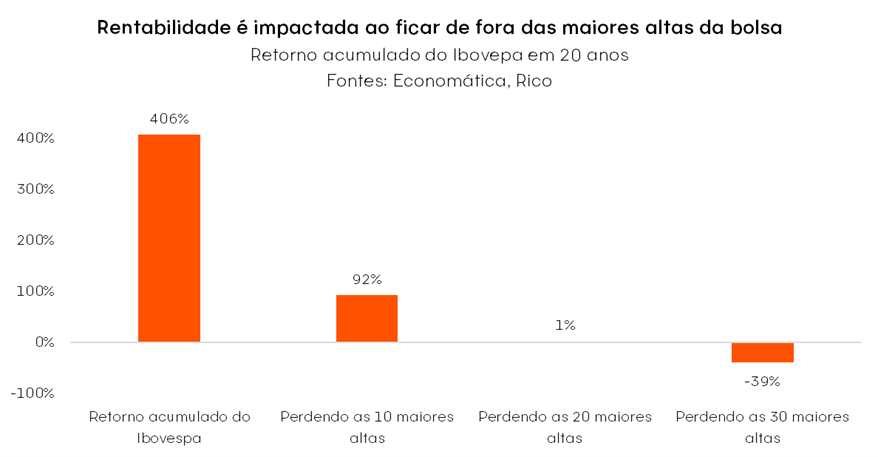 Conforme ilustrado abaixo, os dados revelam que investidores que se mantiveram fora do mercado brasileiro durante os 10, 20 ou 30 dias de maior alta foram penalizados – perdendo boa parte dos ganhos, ou mesmo amargando perdas no período.