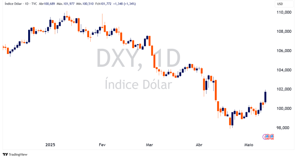 A reação imediata pós-anúncio foi de fortalecimento do dólar no mundo. Observamos uma valorização do dólar em relação às principais divisas, como evidenciado pela alta do índice DXY – índice que mede a cotação do dólar frente a uma cesta de moedas fortes (como o Euro e o Yen), conforme podemos observar no gráfico abaixo: