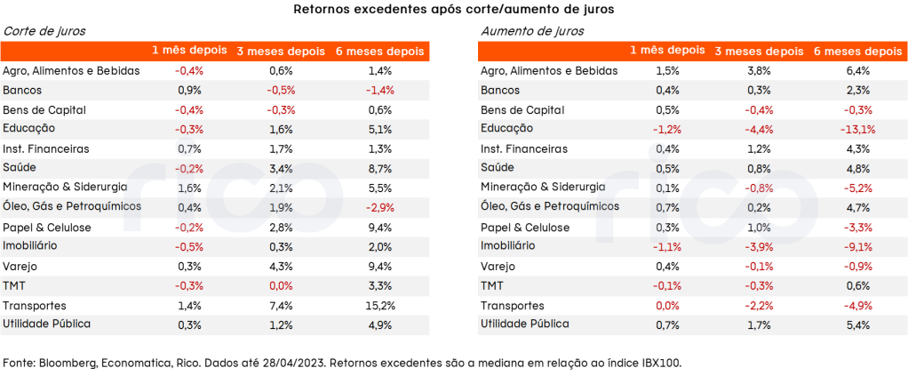 Analisamos as ações na composição histórica do IBX100 em diferentes estágios de ciclos monetários passados desde 2002. Para avaliar o desempenho, calculamos retornos excedentes (ou seja, líquidos da performance da índice) ponderados pelo valor de mercado para cada setor.