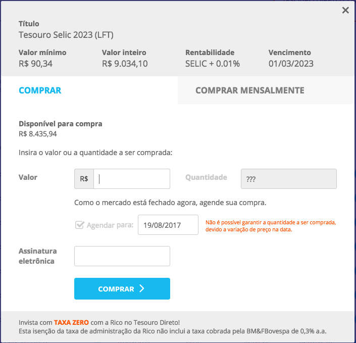 Nesta janela, você definirá o valor a ser investido. Ele deve estar disponível em sua conta na corretora. Depois, basta inserir a sua assinatura eletrônica e clicar em ‘Comprar’.