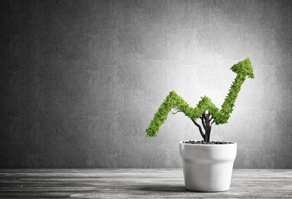 quatro pilhas de moedas enfileiradas com uma muda de planta acima de cada pilha e um pote com diversas moedas com uma planta crescendo, simbolizando investimentos graduais.