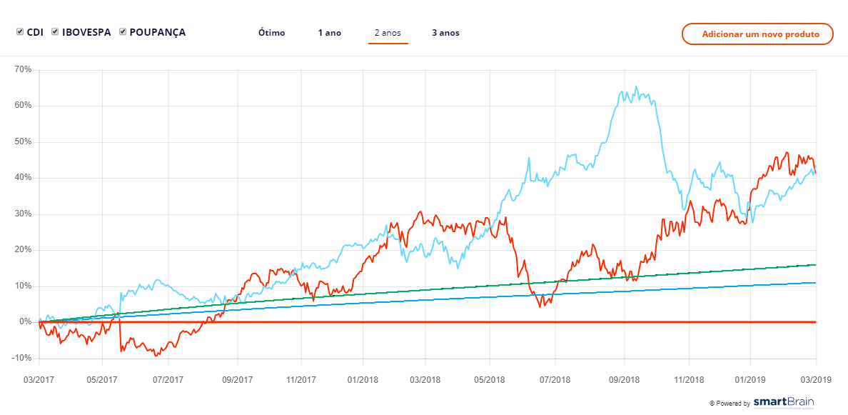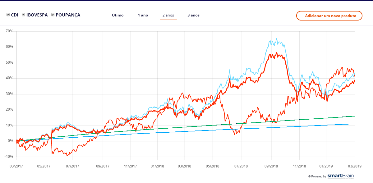 Um gráfico aparecerá e você poderá fazer três configurações: escolher índices de comparação, período de análise e adicionar investimentos (é possível inserir vários simulando uma carteira de aplicações).