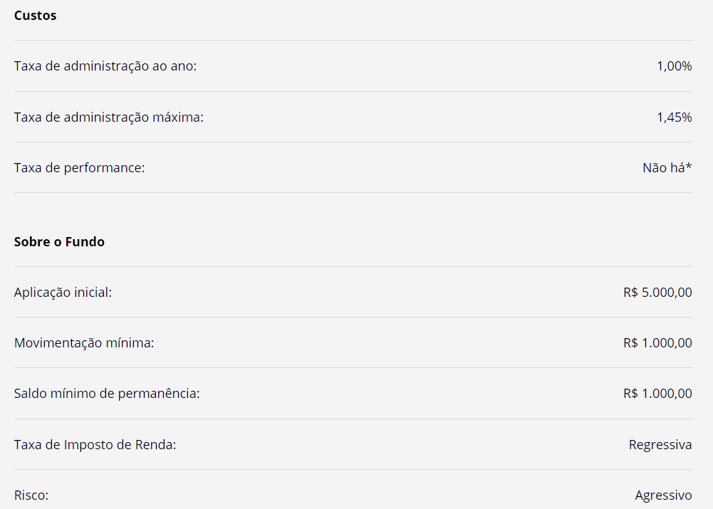 Depois, é fundamental entender quais são os custos cobrados pelo gestor do fundo. Assim como conhecer qual é a aplicação inicial, o mínimo para movimentações e o mínimo para permanência.