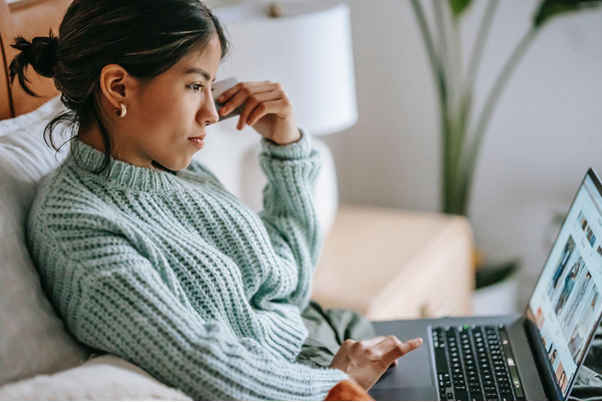 Mulher branca sentada à mesa, pesquisando no notebook sobre o que é IGP-M e seu impacto no aluguel, enquanto faz cálculos com lápis em um papel com valores do IGP-M acumulado.