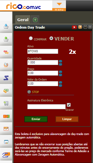 Se for day trade, por exemplo, com R$ 200 de garantia, você tem direito a vender um lote de até R$ 5.000, operando BOVA11 (alavancagem de 25 vezes). Se a sua intenção é prosseguir com a venda, cada papel tem a sua garantia requerida. No caso de BOVA11 o valor a ser depositado como garantia equivale a 118% do preço atual de cotação. É possível verificar os valores no Home Broker da Rico.