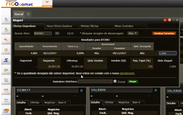 >> Importante: Para tomar o aluguel para a ponta Short, é necessária a margem de garantia, que oscila de ativo para ativo, é importante que o investidor consulte a margem solicitada para o aluguel.