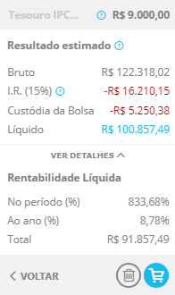 Ao aplicar os mesmos R$ 9 mil nesse ativo hoje, você resgataria R$ 100.857,49 se mantiver o seu investimento até a data de vencimento.