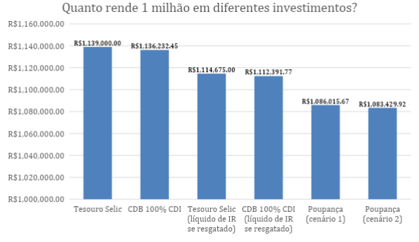 Agora que sabemos como calcular o rendimento da poupança, podemos seguir para analisar o valor recebido em caso de aplicação de 1 milhão de reais.