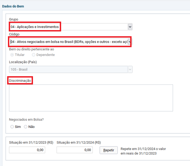 - Selecione o código “04 – Ativos negociados em Bolsa no Brasil”;