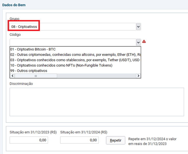 - Selecione o grupo “08 – Criptoativos” e escolha um dos códigos disponíveis conforme o ativo que será declarado;