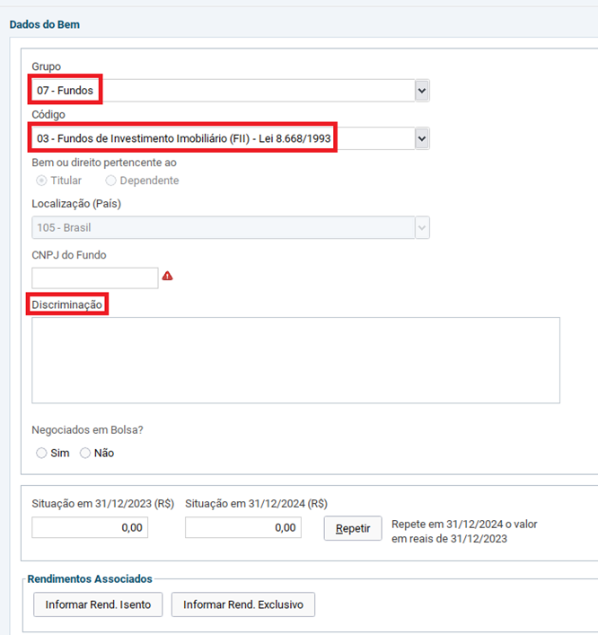 - No campo “Discriminação”, informe a instituição financeira administradora do fundo, o CNPJ do fundo, a quantidade de cotas e o titular;