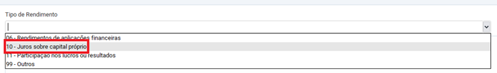 - Selecione o item “10 – Juros sobre Capital Próprio”;