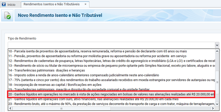 - Selecione o item “20 – Ganhos líquidos em operações no mercado à vista de ações negociadas em bolsa de valores nas alienações realizadas até R$ 20.000, em cada mês, para o conjunto de ações”;