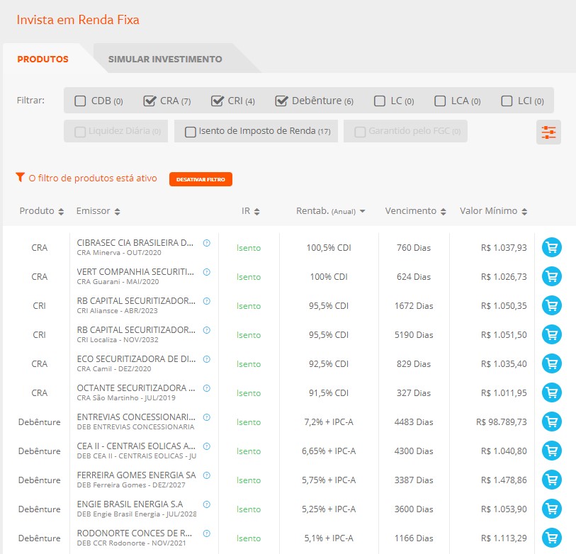 Alguns deles, como os CRIs, CRAs e as debêntures incentivadas são totalmente isentos de IR. Já os FIDC e debêntures comuns possuem um IR retido na fonte, com tabela regressiva ao longo do tempo.
